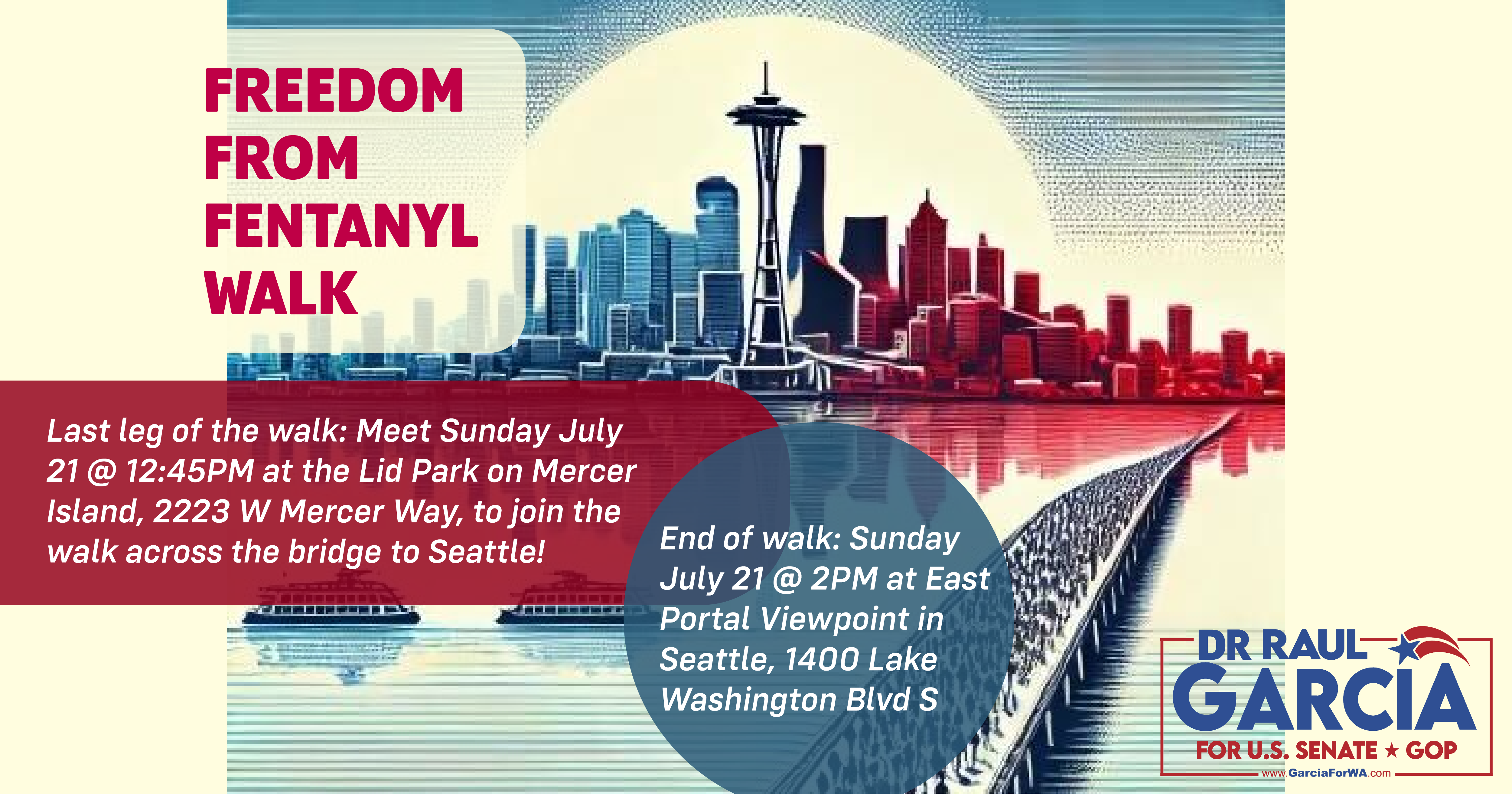 July 19, 2024 – Dr Raul Garcia, candidate for U.S. Senate, will complete his six-day “Freedom From Fentanyl Walk” this Sunday, July 21, with a walk across the I-90 bridge and a gathering and media availability at the East Portal Viewpoint in Seattle at 2pm.