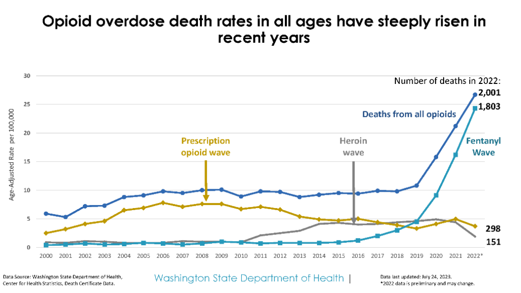 In 2022 alone, there were 1,803 fentanyl overdose deaths in Washington, according to the state Department of Health. Since 2019 there has been a major surge in fentanyl deaths statewide. Nationally, in 2023 there were almost 75,000 fentanyl overdose deaths, and the Center for Disease Control noted that Washington had one of the highest spikes in overdose death rates in the nation.